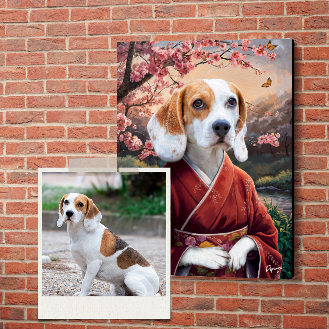 Transformez votre animal de compagnie en reine de beauté japonaise avec notre tableau personnalisé La Geisha. Ce portrait sur mesure capture l'élégance et le charme asiatique de votre compagnon, la présentant comme une noble nippone de l'ère Edo.